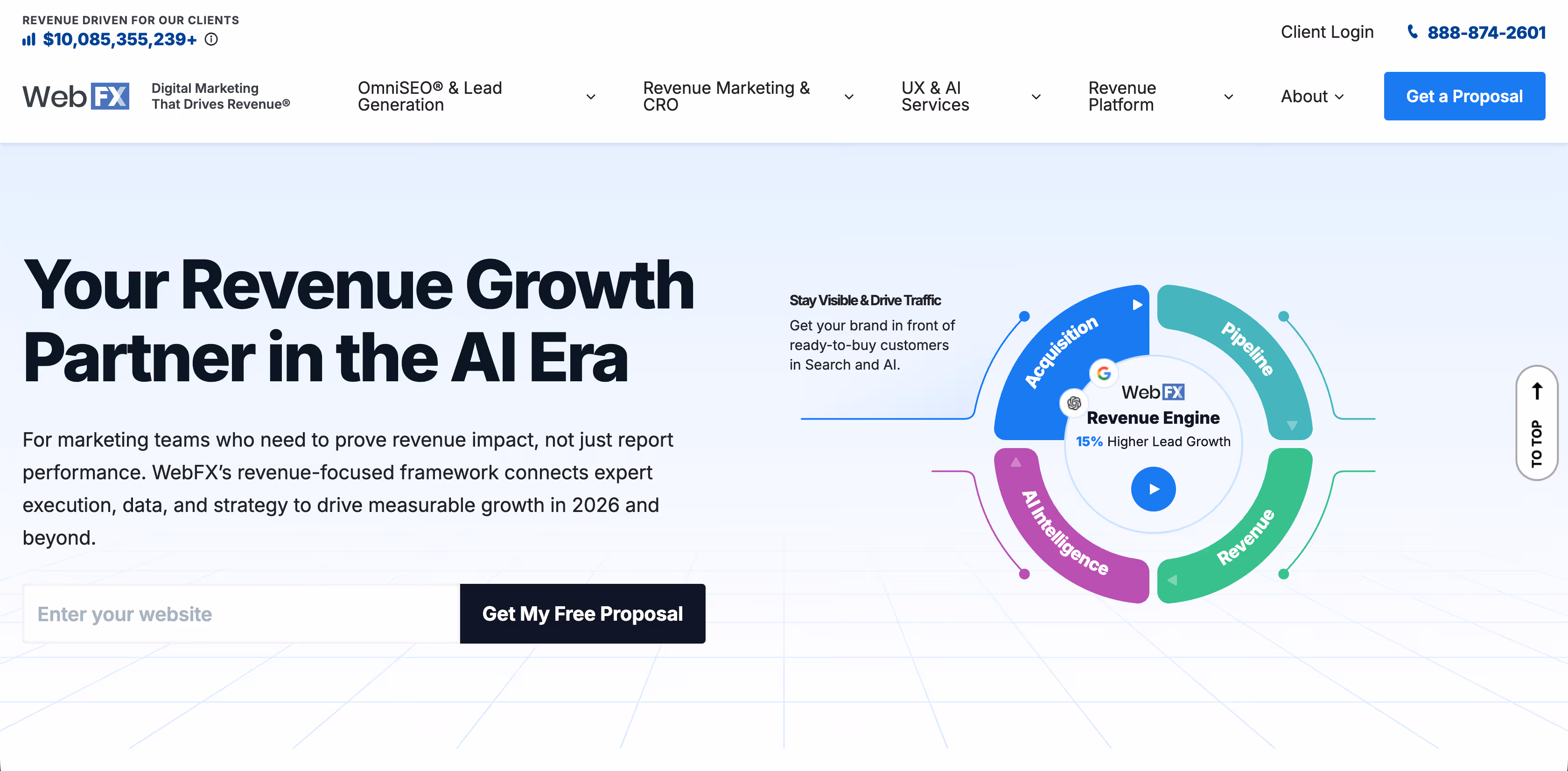 WebFX is a full-service digital marketing agency that focuses on revenue-focused SEO. They emphasize connecting SEO performance to qualified leads, pipeline growth, and bottom-line revenue using tools like their RevenueCloudFX platform.